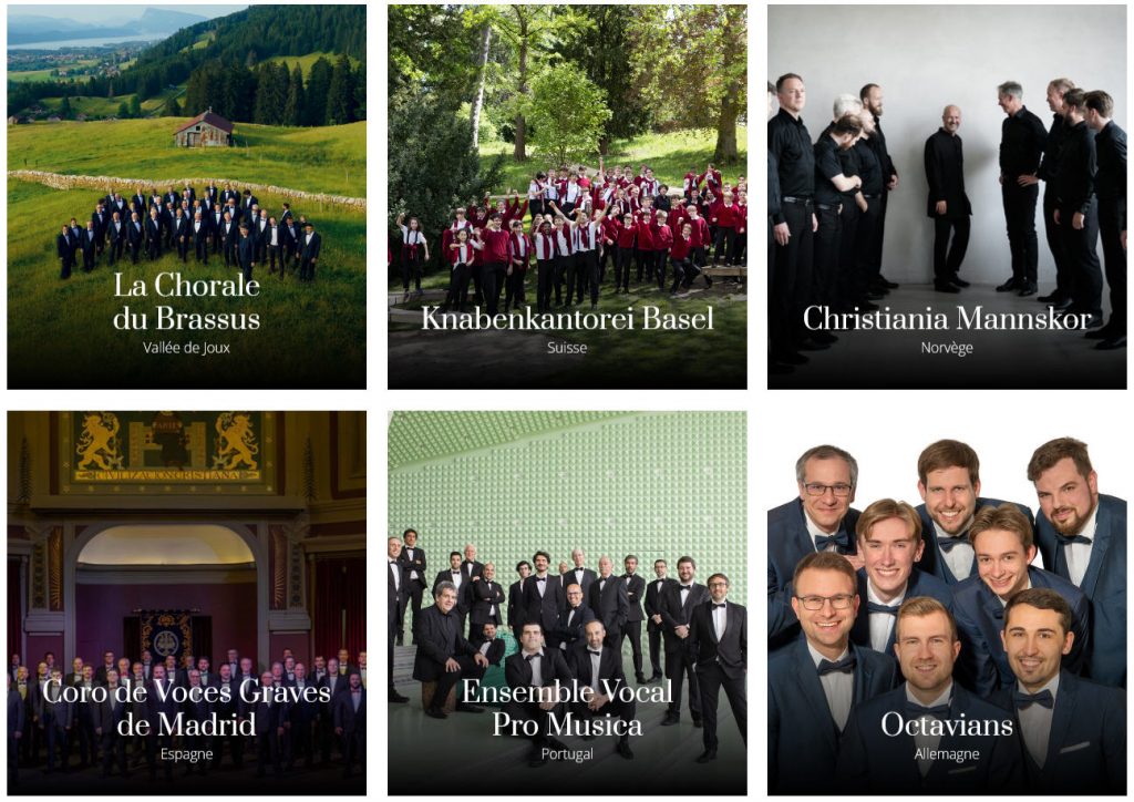 Este año acogerá a coros profesionales y amateur de alto nivel de Suiza, Noruega, España, Portugal y Alemania: La Chorale du Brassus (CH), Knabenkqantorei Basel (CH), Christiania Maanskor (NO), Coro de Voces Graves de Madrid (ES), Ensemble Vocal Pro Musica (PT), Octavians (DE).