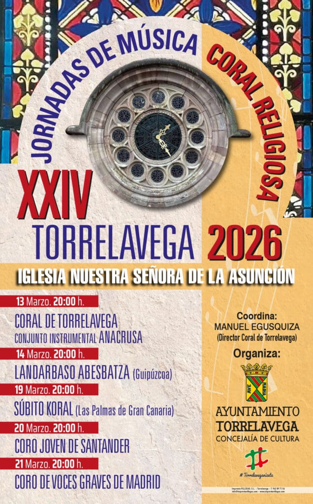 La Iglesia de la Asunción de Torrelavega acogerá los días 13, 14, 19, 20 y 21 de marzo, a las 20.00 horas, una nueva edición de las Jornadas de Música Coral Religiosa, una cita ya consolidada dentro del calendario cultural de la ciudad que contará con la participación de cinco agrupaciones corales procedentes de distintos puntos de España, siendo el Coro de Voces Graves de Madrid el encargado de cerrar el ciclo. Todos los conciertos tendrán entrada libre y gratuita.