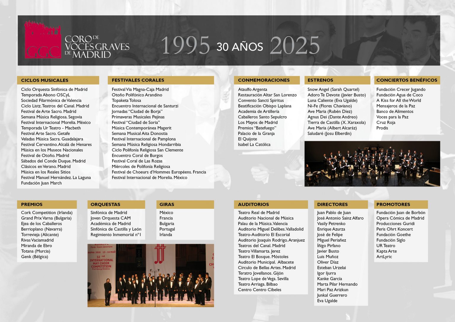 Voces Graves de Madrid cumple 30 años en 2025. Durante este viaje ha tenido la oportunidad de participar en los festivales, auditorios y ciclos más importantes del país, realizando una intensa labor de apoyo a compositores españoles mediante estrenos absolutos y colaborando con grandes directores.